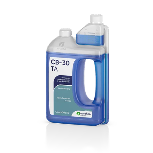 CB-30 TA é indicado na desinfecção de instalações e equipamentos agropecuários, tais como cama de aves, aviários, câmaras incubadoras, bandejas, maternidades, creches, salas de ordenha, rodolúvio e pedilúvio.